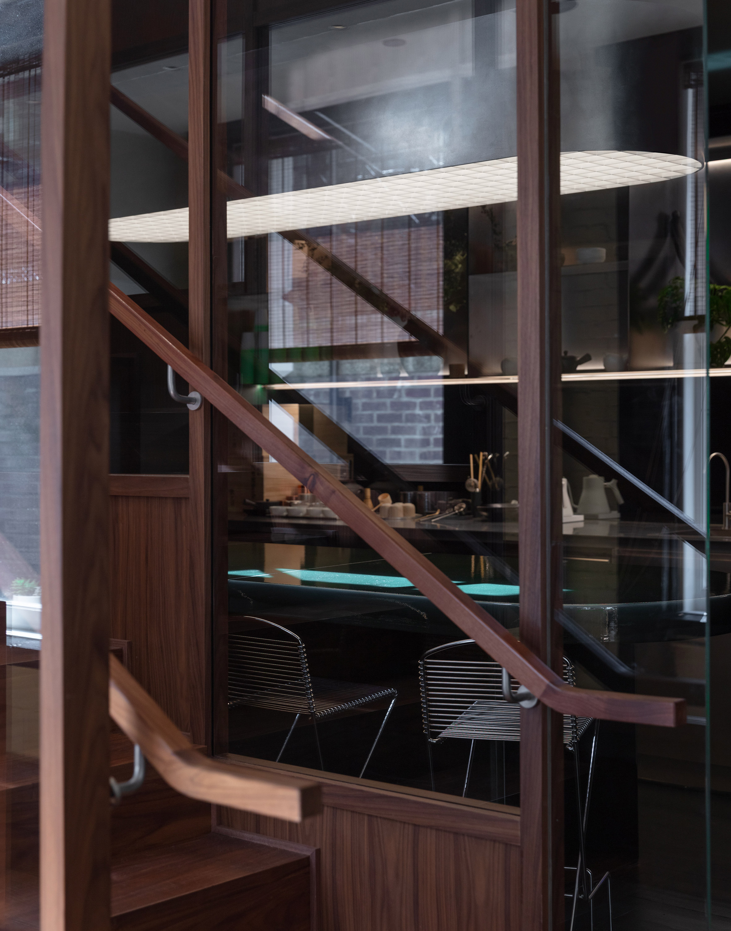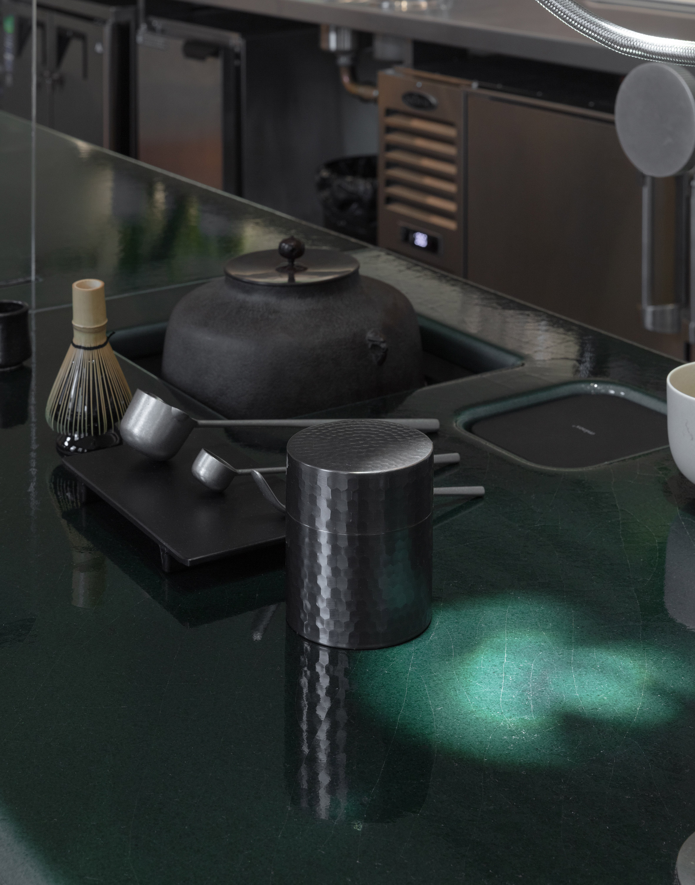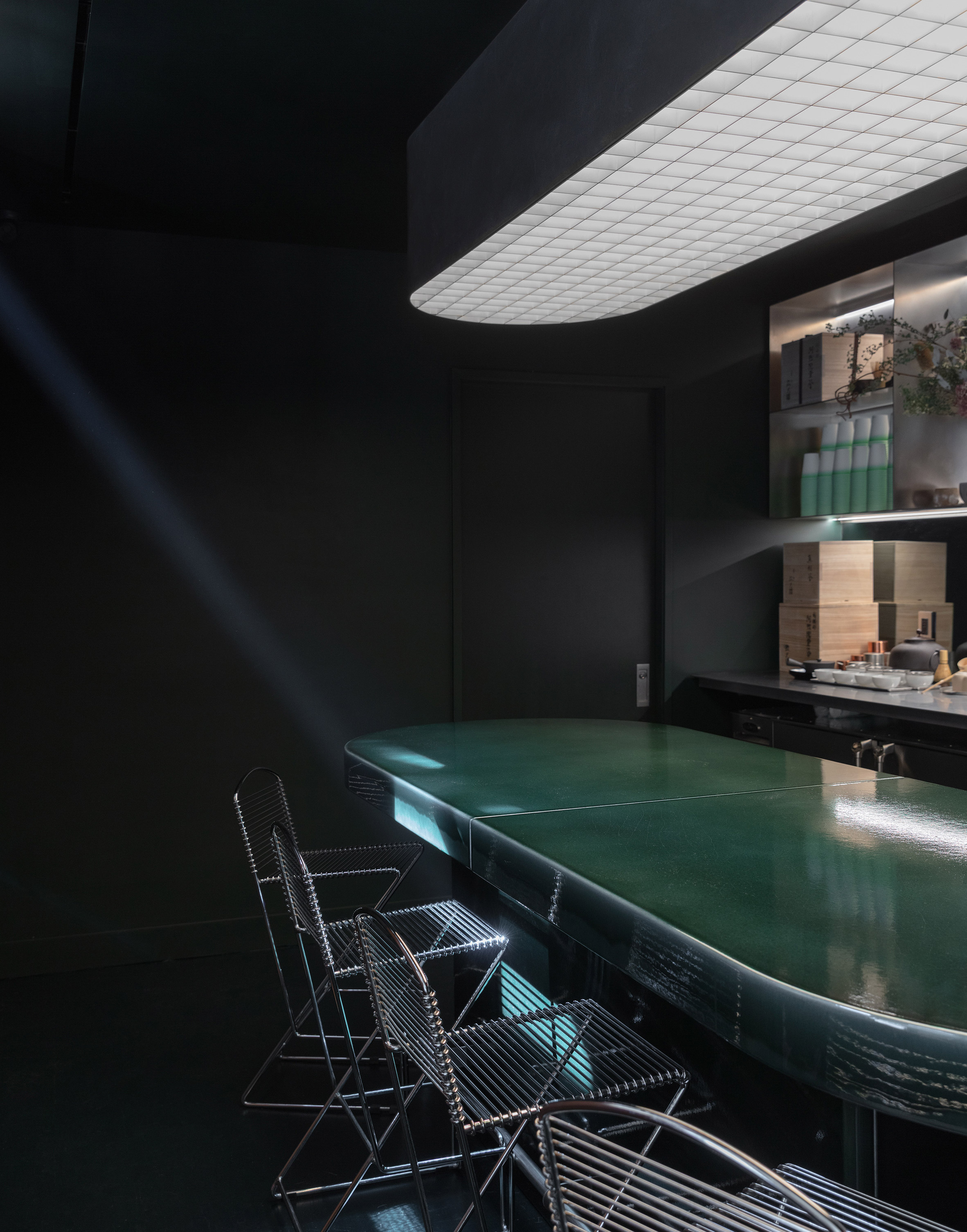為了引導顧客的情緒流轉,建築師大筆一揮,將上下兩層樓規劃成涇渭分明的兩種氛圍。一樓入口處,是「明亮且活躍」的社交場域。一座深綠色搪瓷熔岩石打造的長吧台,成為空間的定海神針,所有抹茶的調製過程在此上演。此處保留了大面積對外窗,引入都市的脈動與光線,並配置了若干復古單椅與實木家具,鼓勵顧客停留、交談。 相較之下,通往地下層的動線,則預告了一趟走向內心世界的旅程,氣氛轉為「內省式」的靜謐,空間的節奏由快轉慢,別有洞天。