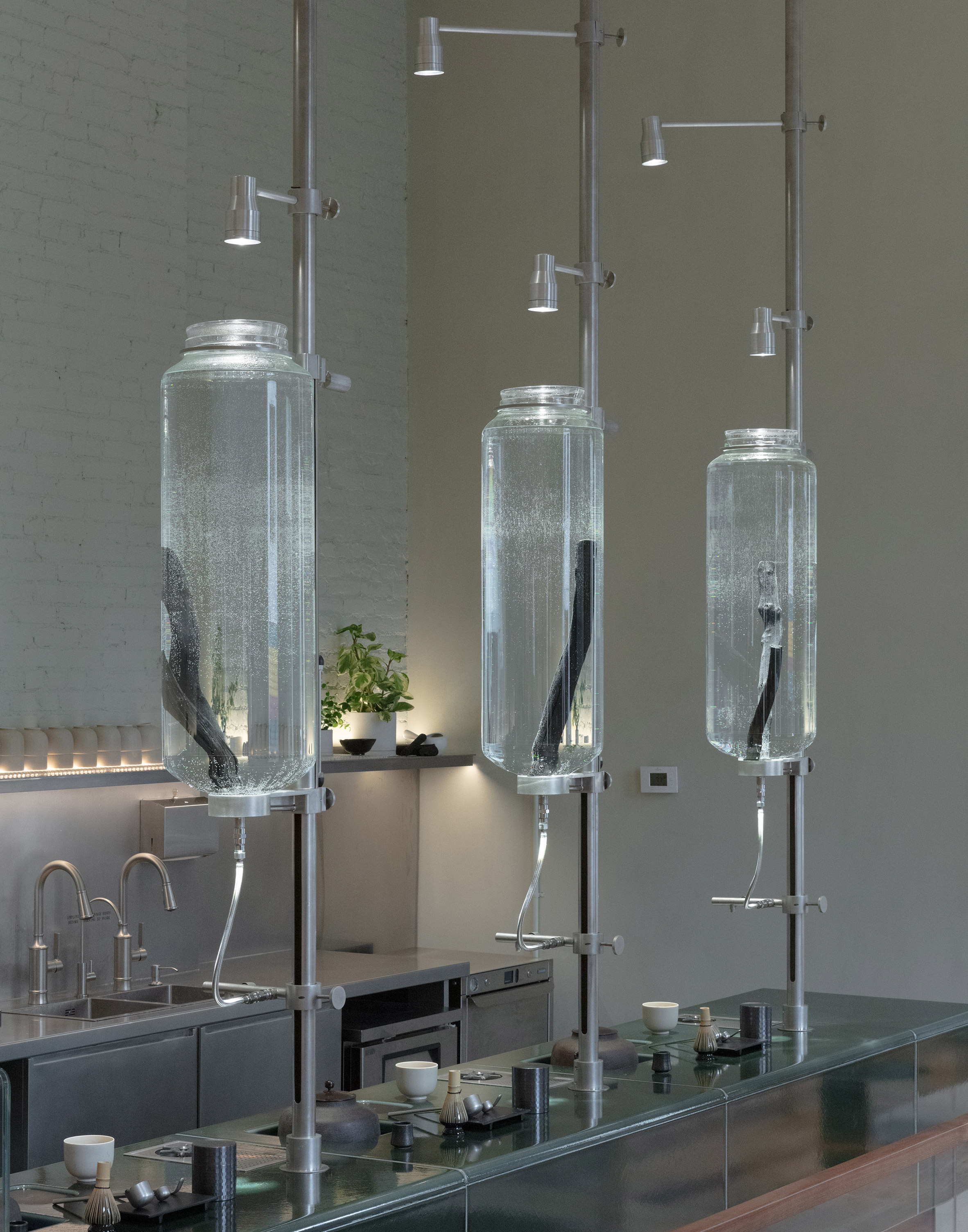 在吧台後方,三座大型玻璃容器昂然佇立,成為一樓空間最引人注目的焦點。容器內並非尋常裝飾,而是浸泡著數根碩大的日本備長炭(Binchotan)。這套由 Ciguë 為永續辦公環境開發的過濾系統,在此被重新設計,以滿足12 Matcha的商業營運需求。 備長炭的多孔質結構能有效吸附雜質,同時釋放礦物質,平衡水質的酸鹼值,用以沖泡抹茶,更能引出茶湯的甘醇。建築師將淨水這個幕後準備工作,轉化為一場公開的視覺儀式,不僅彰顯品牌對品質的吹毛求疵,更成為一種強而有力的品牌敘事。