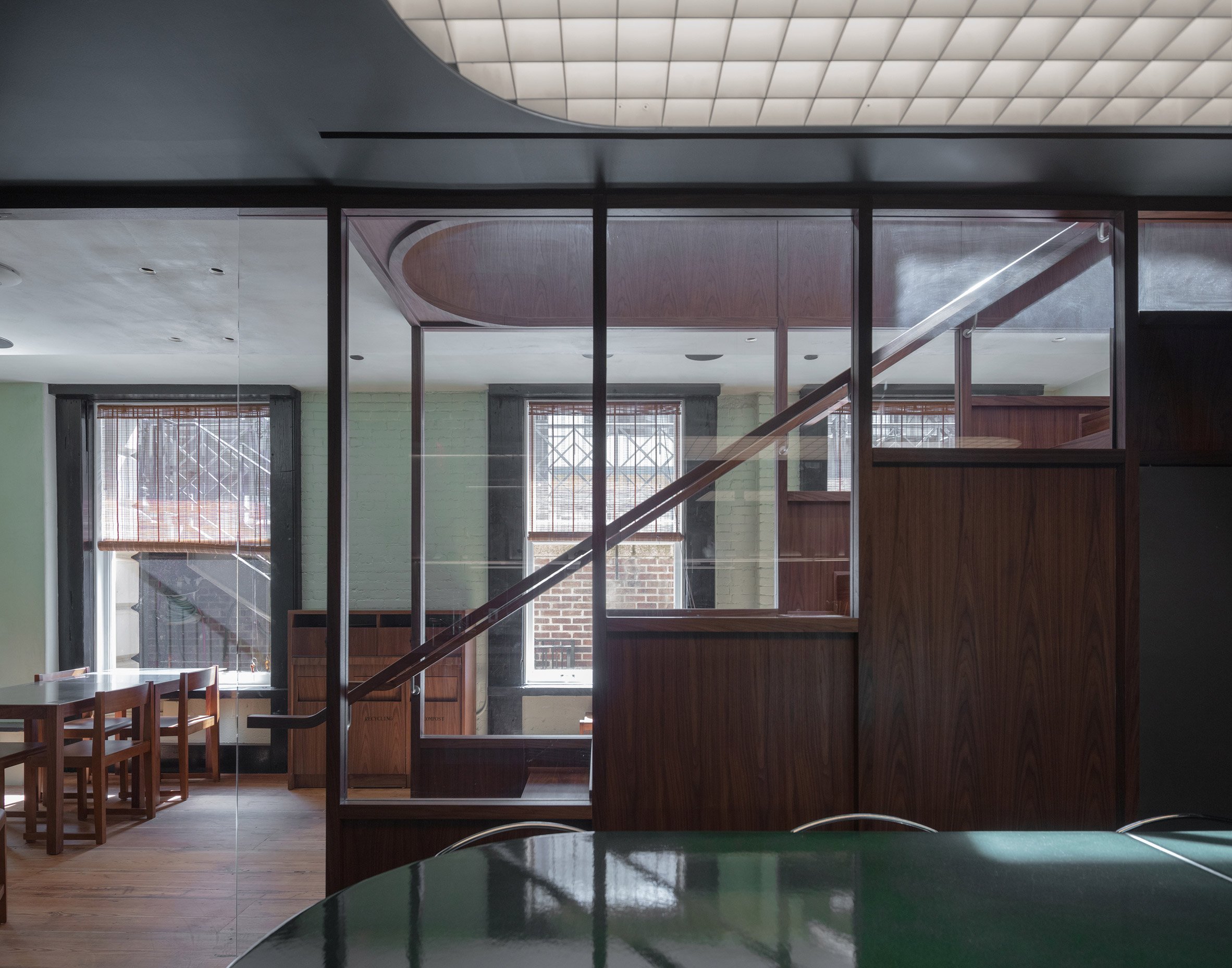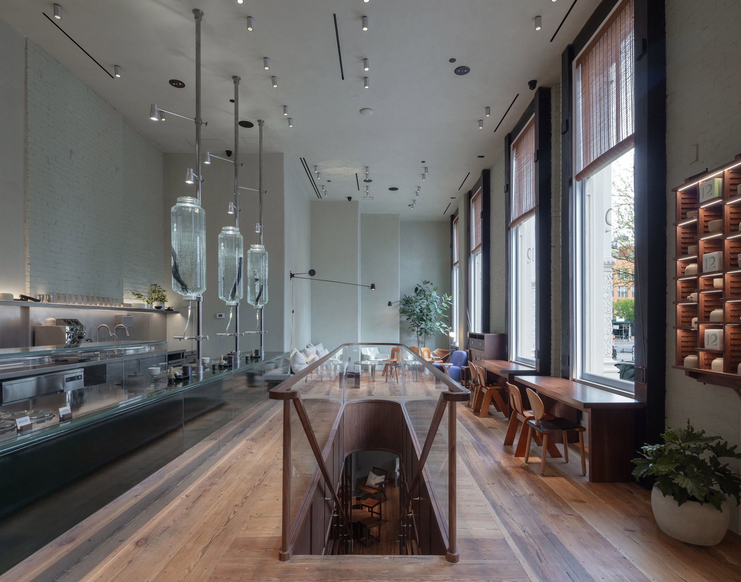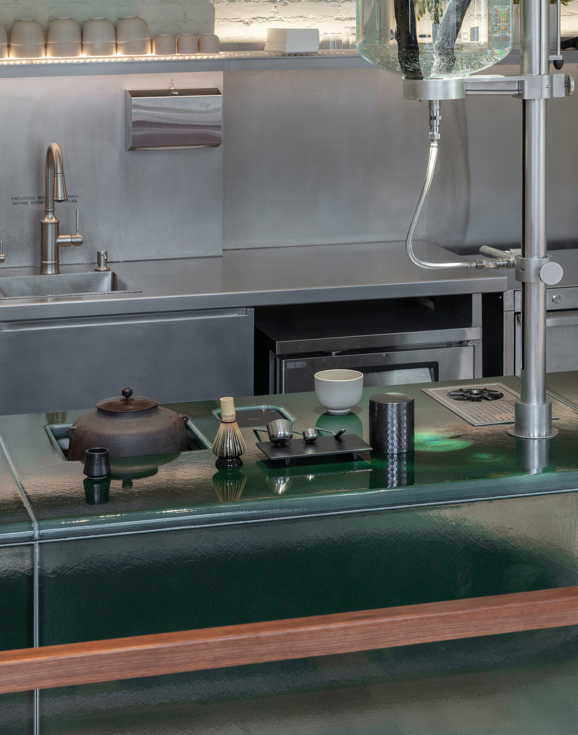 地下一隅,一座由玻璃圍起的品鑑室,被貝納爾形容為「一部分是實驗室,一部分是聖殿」。這處半開放的空間,讓品茶或研發的專注姿態,化為公共休憩區一道靜態的風景。設計團隊在與業主及品牌顧問公司Base Design參訪日本後,對當地茶園中光線篩過樹葉的樣態念念不忘。那種被過濾後的柔和光暈,啟發他們為店面的所有窗戶裝上百葉簾。此舉成功地在車水馬龍的曼哈頓中心,複製出那份令人心安的靜謐光感,為整趟品牌體驗,畫下一個餘韻悠長的句點。