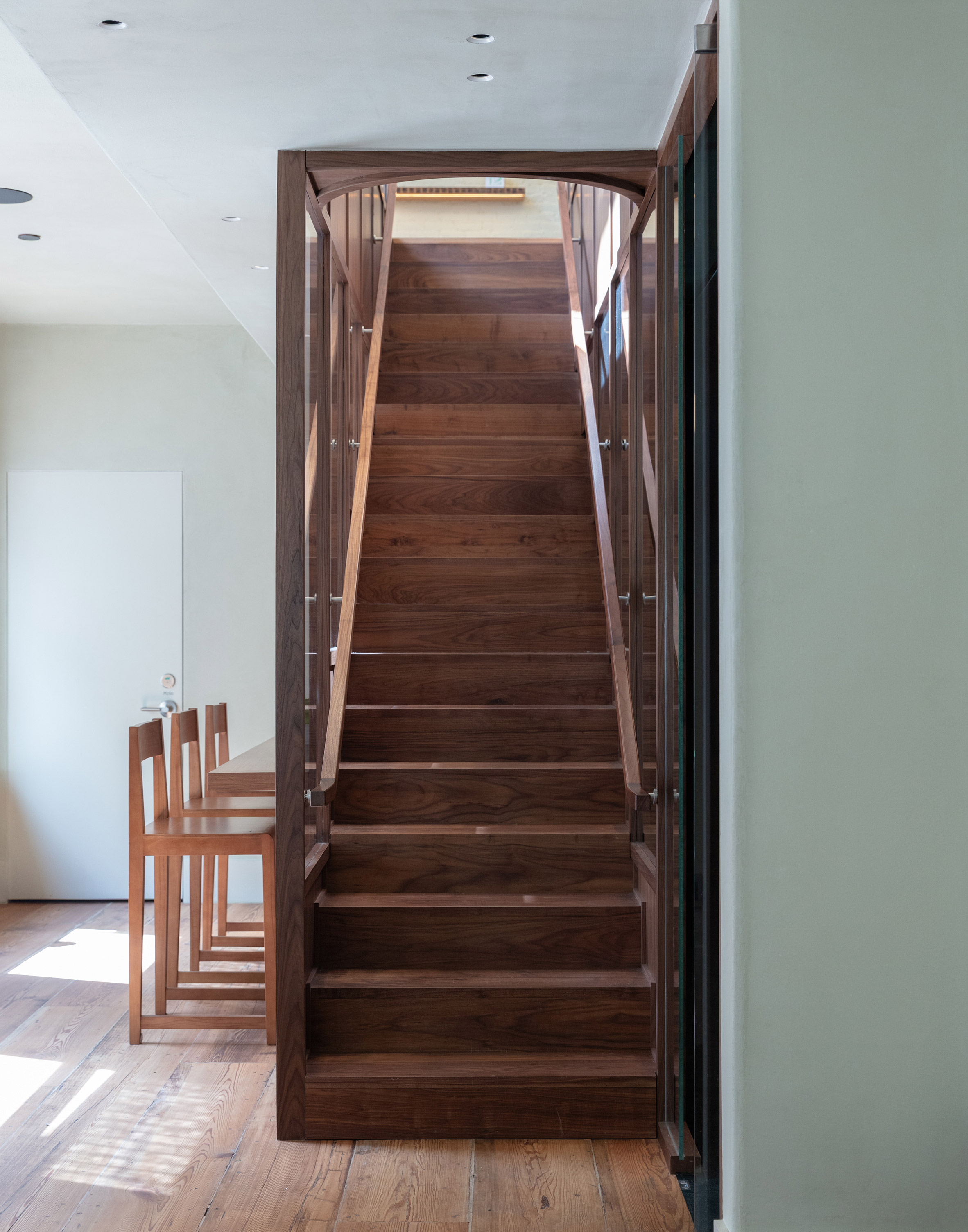 在處理空間的歷史層次時,Ciguë 表現出高度的尊重與自制。他們選擇保留原有的花旗松(Douglas fir)木地板,那些經年累月留下的磨損與色澤,如實記錄了建築的滄桑。與此形成鮮明對比的,是通往樓下、以全新核桃木打造的樓梯與家具。 整體室內設計採用核桃木呈現溫潤質感,與粗獷的松木地板形成一場跨越時空的材質對話。新舊元素的並陳,讓過去與現在於同一個屋簷下相輔相成,而非相互傾軋,顧客行走其間,彷彿能觸摸到時間的流淌。