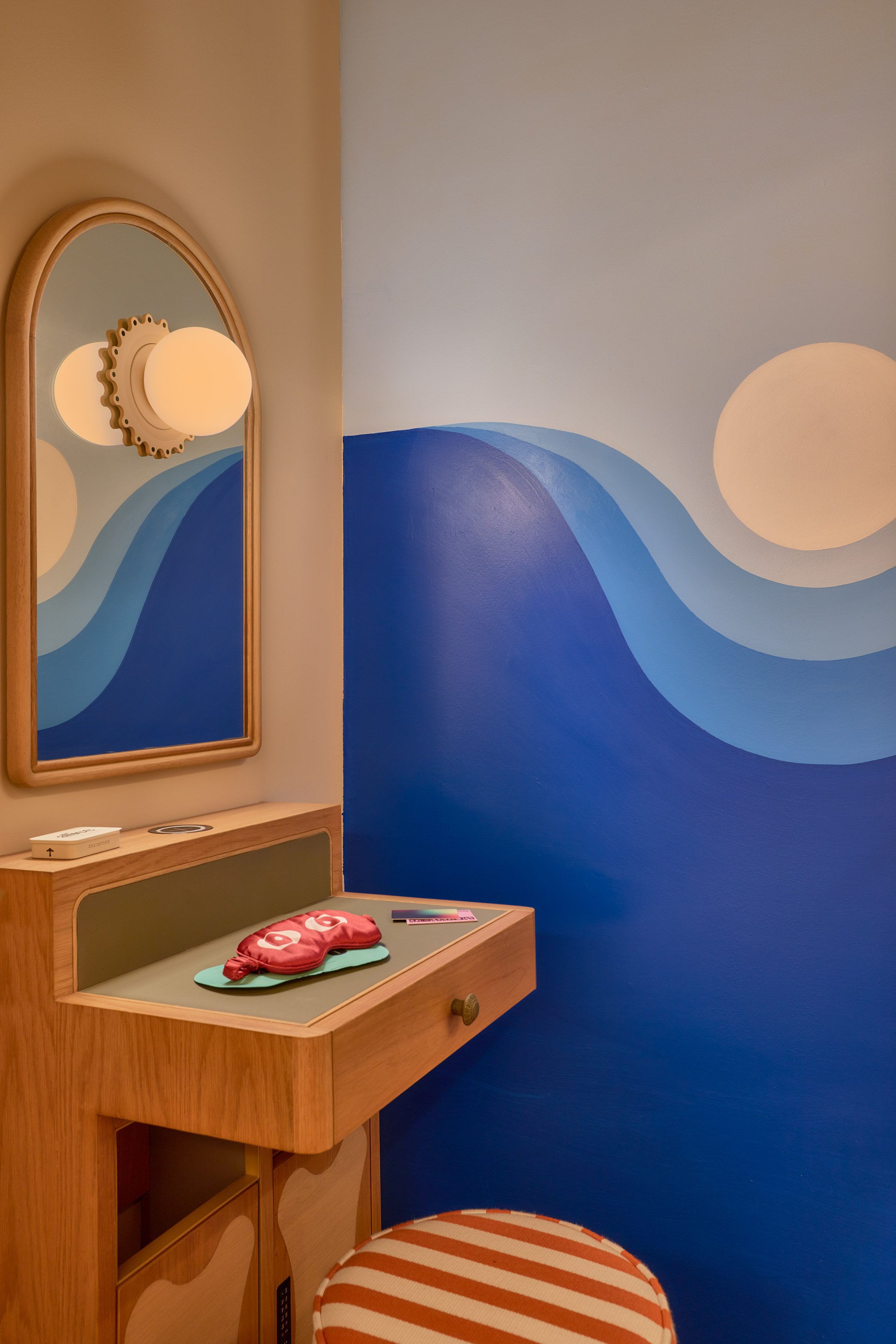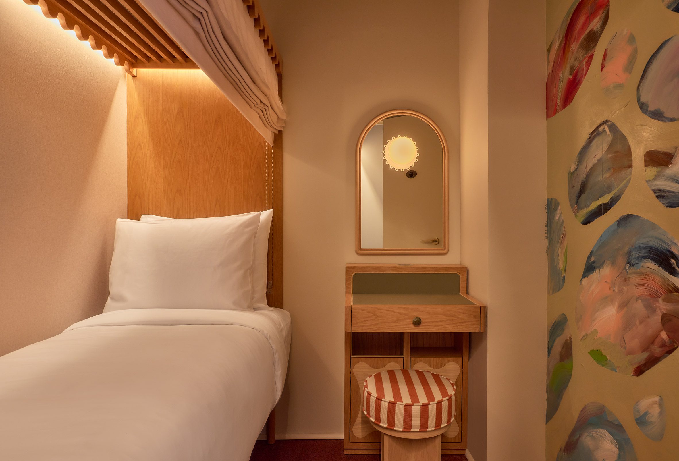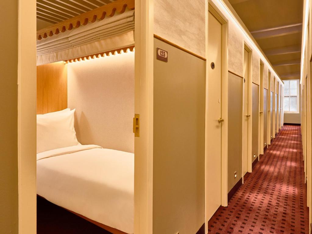 每個客艙的面積僅有三十二平方英尺(約三平方公尺、0.9坪),卻是Islyn Studio空間運籌能力的極致展現。設計團隊將每一間客艙視為一個安穩的「繭」,為旅者量身訂製了多功能家具系統。 在有限的範圍內,巧妙地整合了行李存放、貴重物品保險櫃、影音娛樂、衣物吊掛等多重用途,堪稱麻雀雖小,五臟俱全。單人床墊經過特別訂製,搭配從波浪邊緣木質頂篷拉下的遮光簾,確保高品質的睡眠隱私。設計理念再度顛覆了傳統旅宿對於坪效的想像,將機能與美學壓縮在極小的體積內,創造出驚人的空間效益。