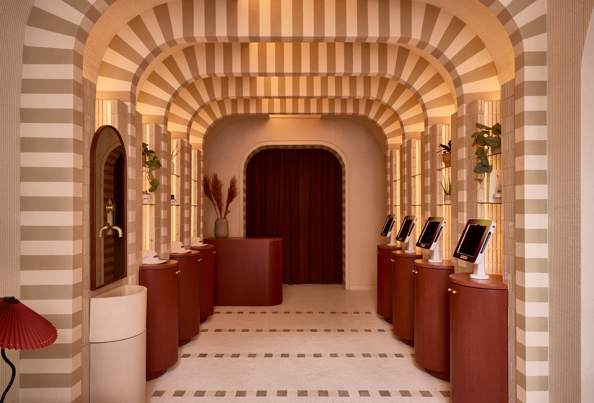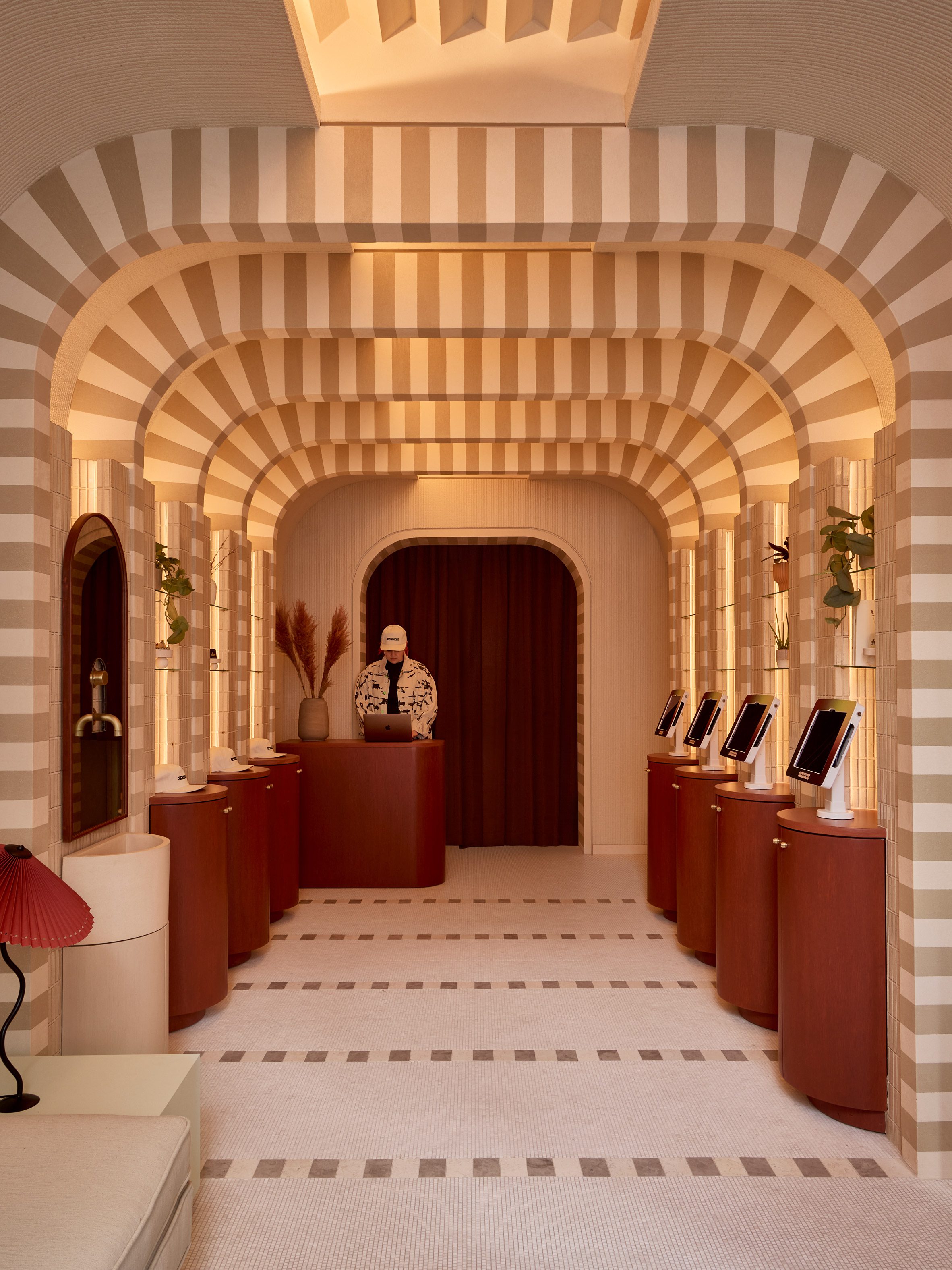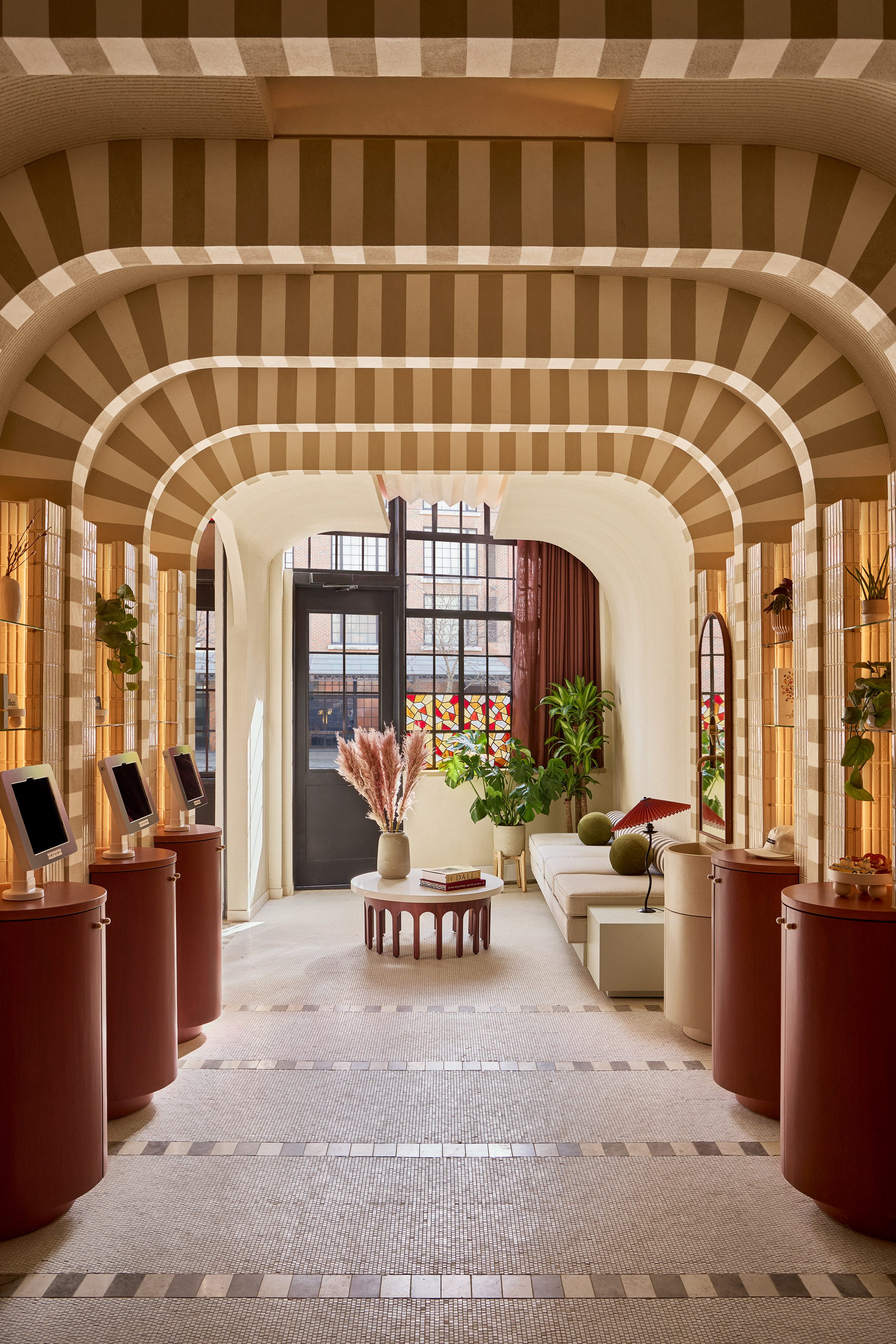 Now Now Noho 酒店大廳,是為旅人揭開序幕的儀式性空間。紐約的 Islyn Studio 在此運用了一系列條紋拱門,創造出宛若時空隧道的視覺引導,引人步入其中。在這些門戶之間,嵌入磁磚壁龕的圓柱形木質高台,一側設置了自助登記入住的機台,另一側則陳列著品牌商品,將機能與商業展示安排得恰到好處。 緊鄰著彩繪玻璃街景的休息區,延續了中性的色調,從手工鏝抹的灰泥牆面、馬賽克地坪到沙發軟裝,呈現出一種高度整合的視覺語彙。設計師稱這種粗獷自然材質與光滑表面的並陳,是為了營造一種既夢幻又踏實的感受,喚起旅人內心的驚奇感。
