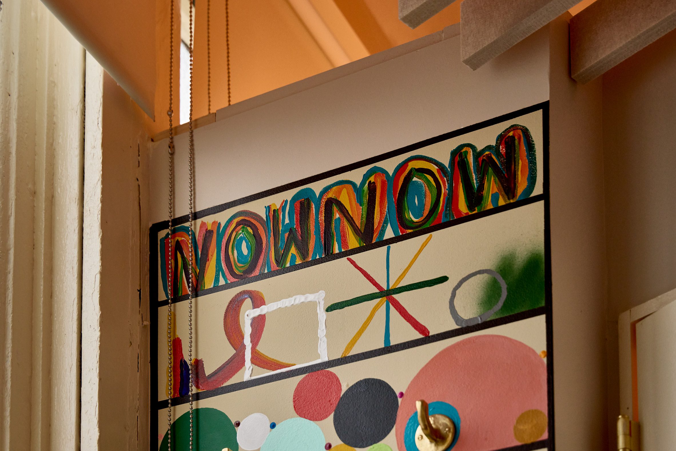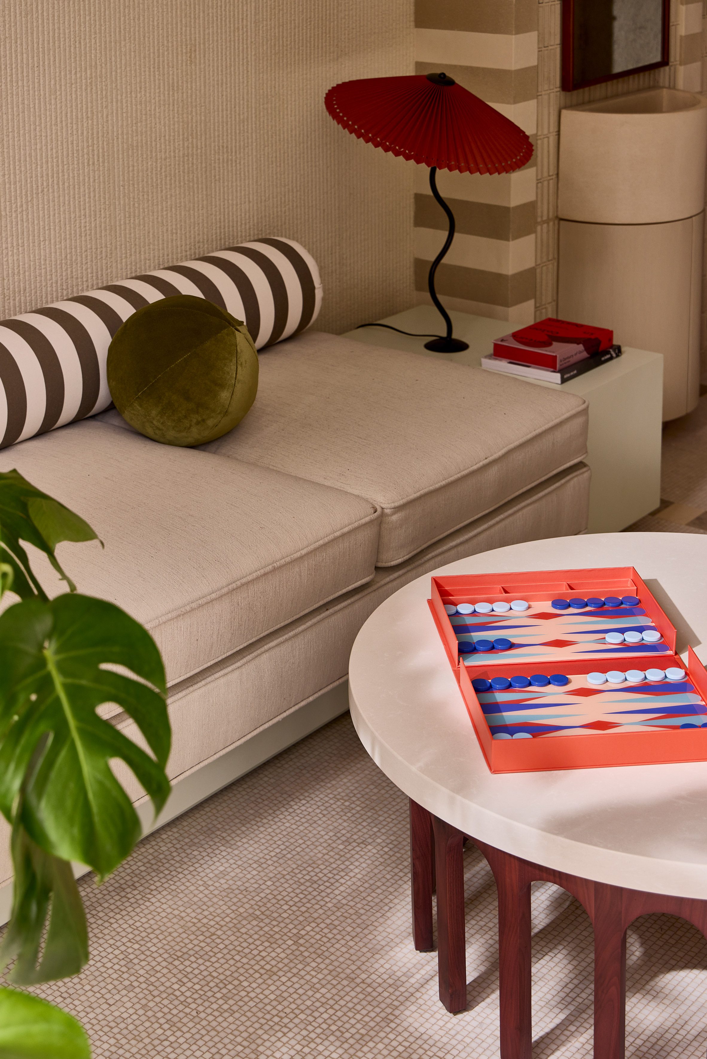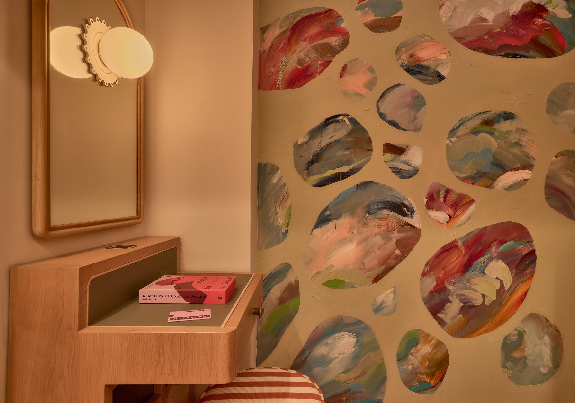 Now Now Noho 酒店大廳,是為旅人揭開序幕的儀式性空間。紐約的 Islyn Studio 在此運用了一系列條紋拱門,創造出宛若時空隧道的視覺引導,引人步入其中。在這些門戶之間,嵌入磁磚壁龕的圓柱形木質高台,一側設置了自助登記入住的機台,另一側則陳列著品牌商品,將機能與商業展示安排得恰到好處。 緊鄰著彩繪玻璃街景的休息區,延續了中性的色調,從手工鏝抹的灰泥牆面、馬賽克地坪到沙發軟裝,呈現出一種高度整合的視覺語彙。設計師稱這種粗獷自然材質與光滑表面的並陳,是為了營造一種既夢幻又踏實的感受,喚起旅人內心的驚奇感。