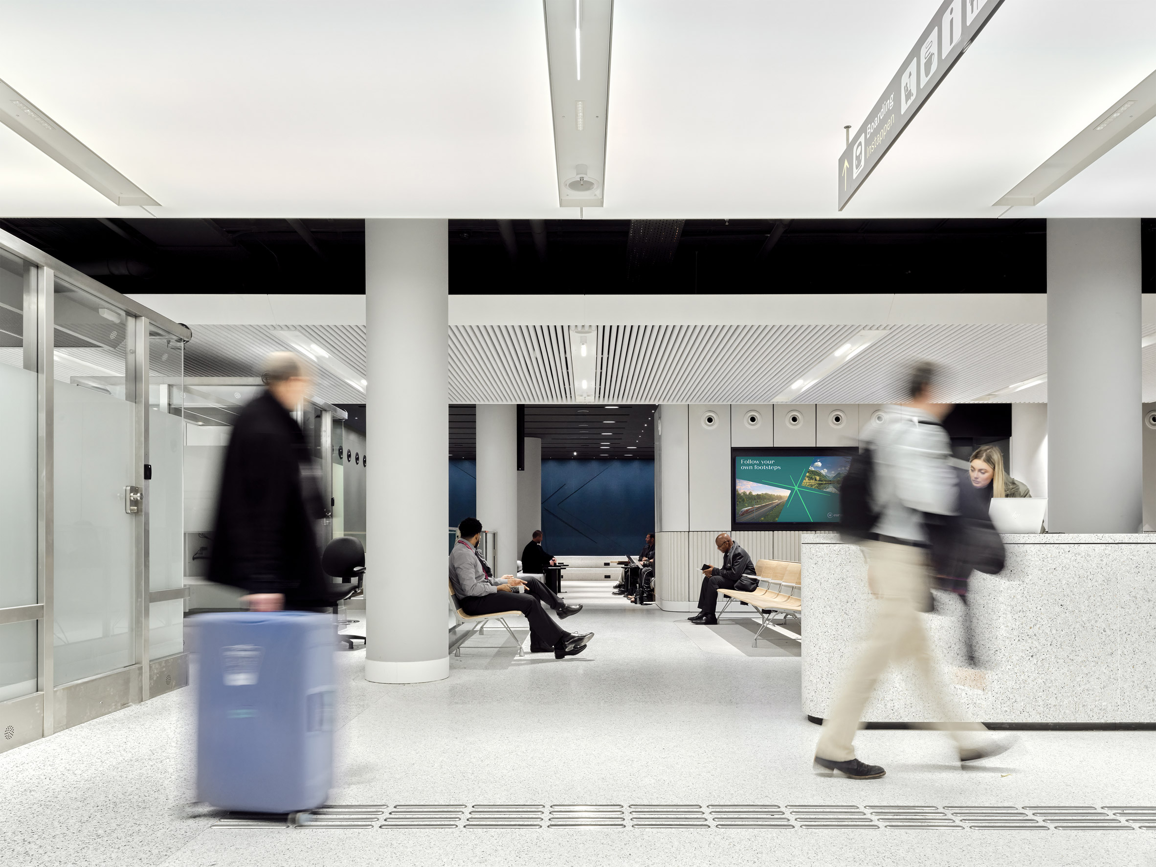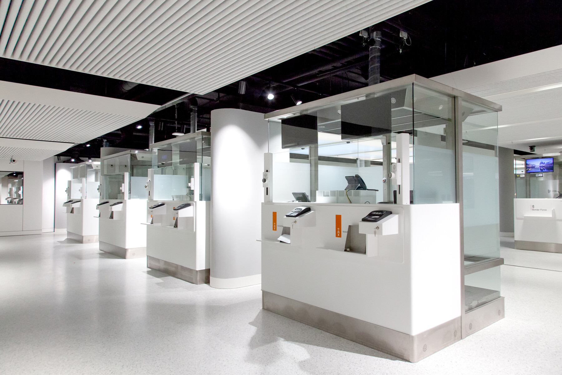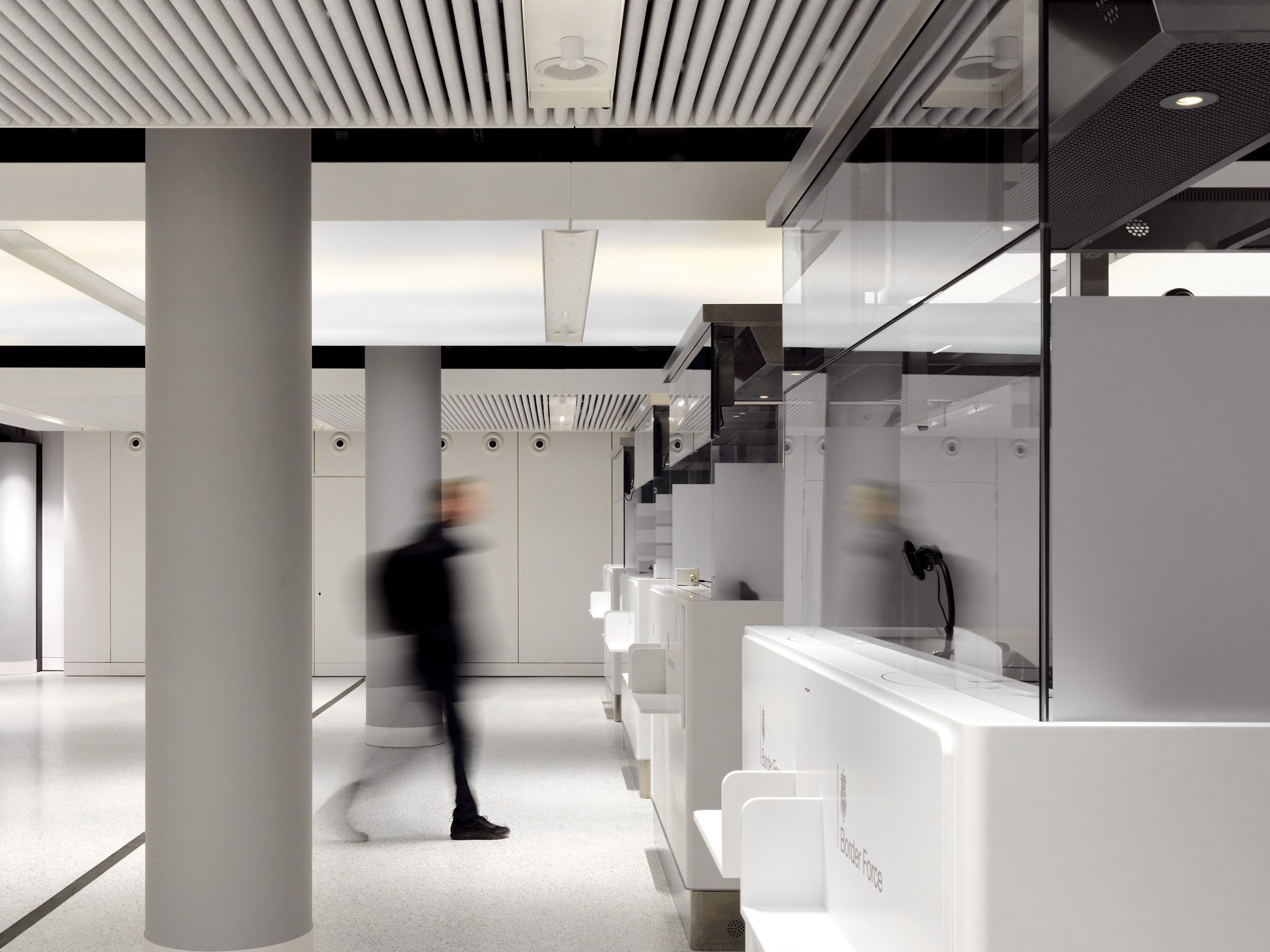 新候車室座落在中央車站地下的阿姆斯特爾通道(Amstelpassage)內。旅客自面向城市的主要入口進入後,依序通過行李安檢、荷蘭與英國雙邊的護照控制和邊境檢查設施,隨即抵達寬敞的候車區域。通關區域的室內設計採極簡風格,圓弧形天花板呼應庫柏斯1889年完成的車站桶形拱頂。 Superimpose建築師魯本·伯岡巴赫特(Ruben Bergambagt)形容:「室內設計連結過去與未來」。曲線頂棚既向歷史致敬,也融入現代美學語彙,營造出歷史與現代相互輝映的氛圍。