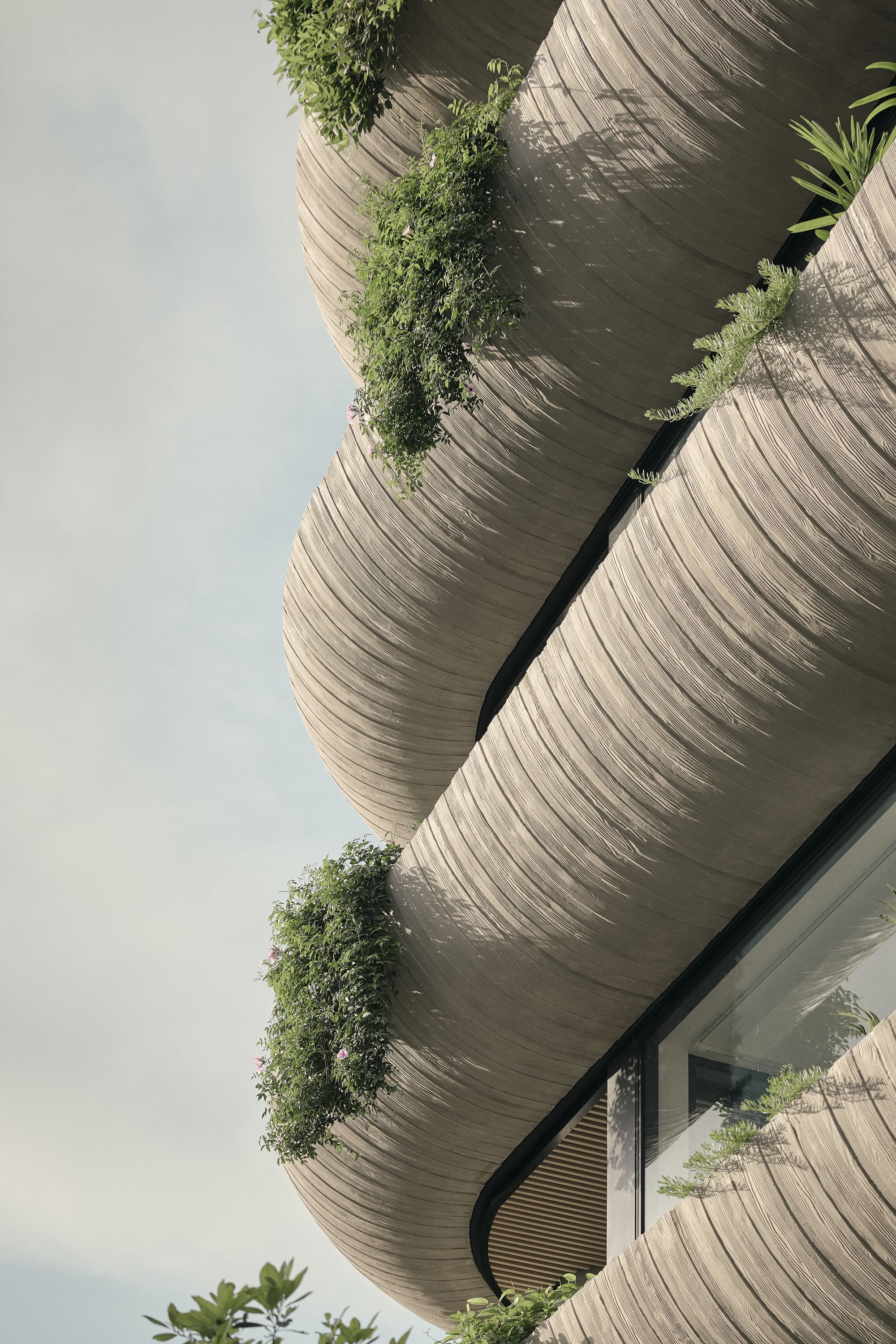 Maison New Farm 的設計願景,從攝人心魄的影像中不言而喻。所座落的區域,周遭不乏線條生硬的粗獷主義建築,新建築的出現,猶如一股清流。建築師採用了訂製的弧形花台,這種工法運用在住宅案應屬開創先河。花台以柔和的姿態,瞬間軟化了周邊環境的剛硬線條。細看之下,花台表面更帶有精緻的木紋板模質感,進一步提升了立面的豐富層次。相較於同區其他建案,開發商在Maison 蒼翠繁茂的景觀設計上,投入了非比尋常的时间與心血。