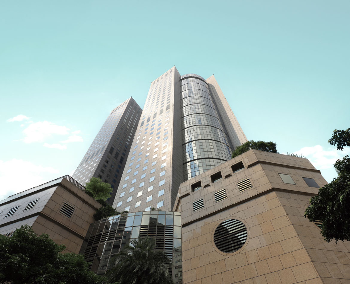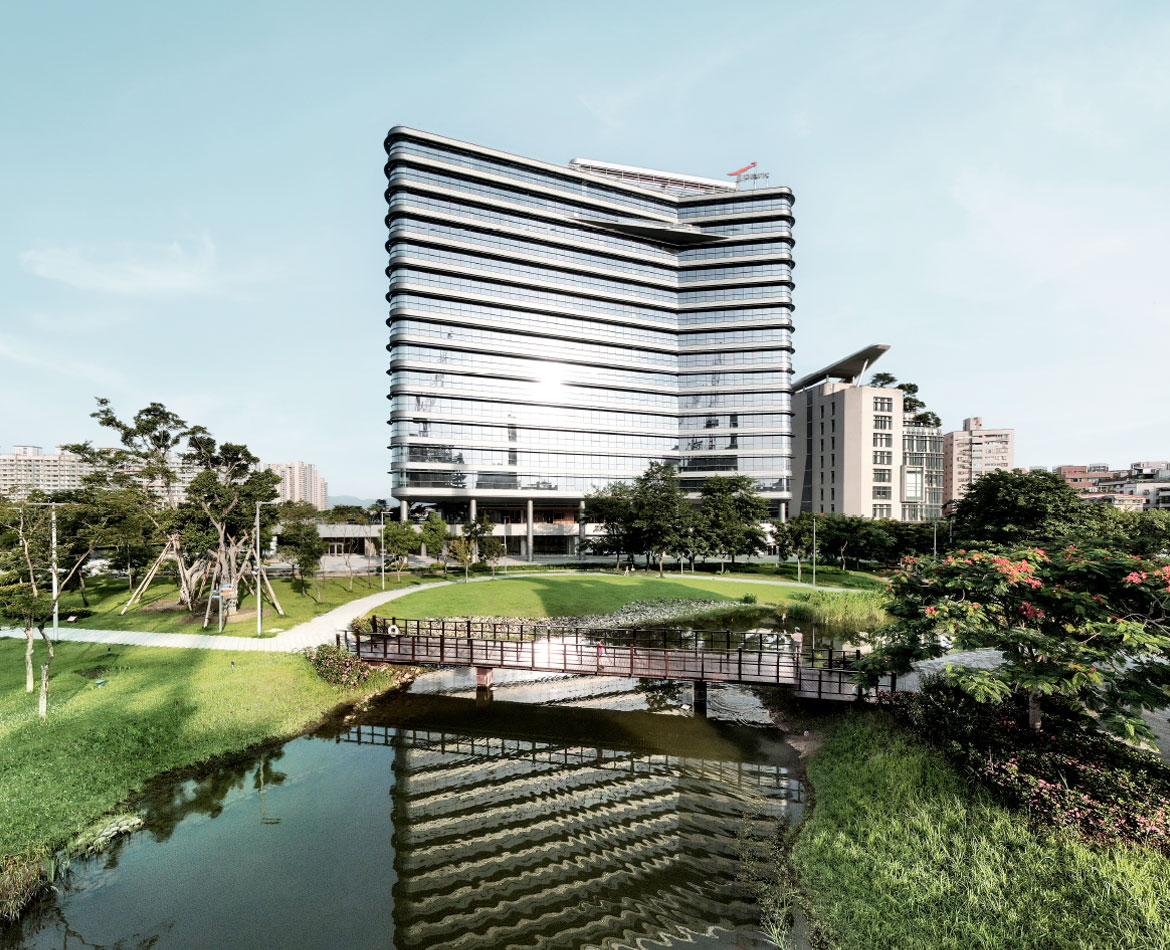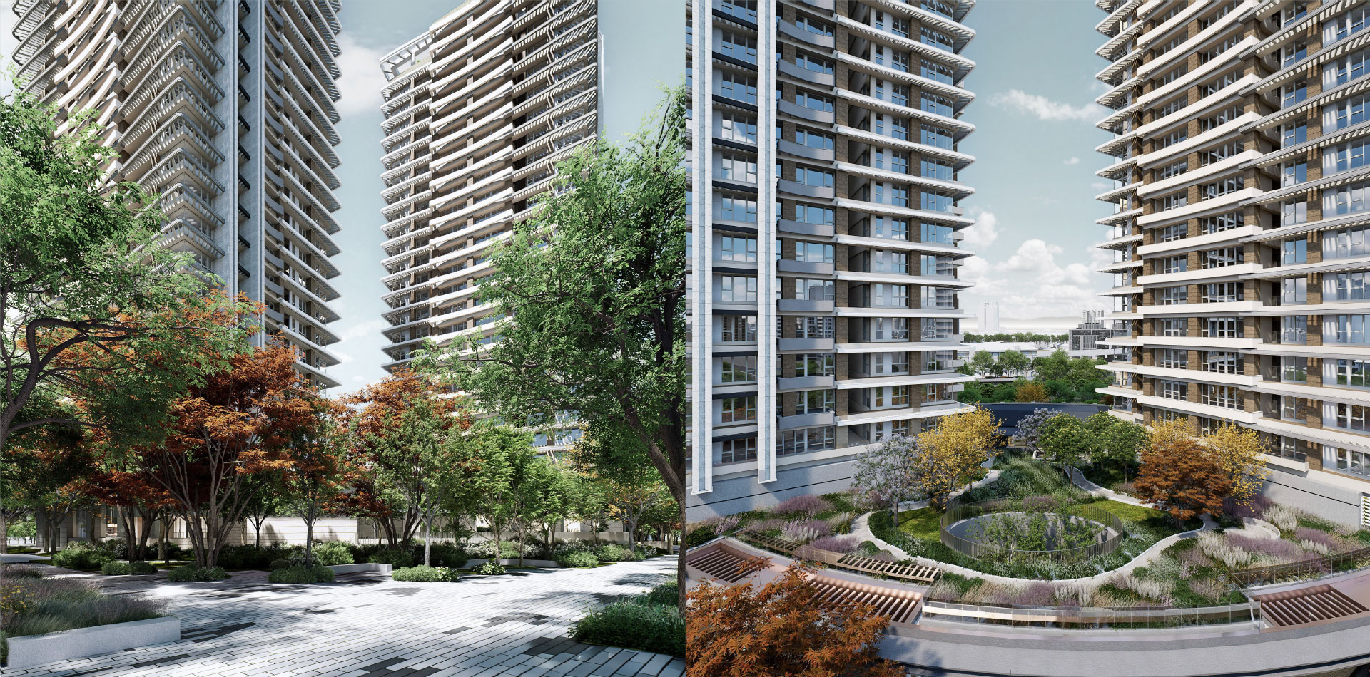 運用雙塔建築的裙樓構造,縱向佈設綠韻空間
